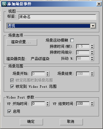 “添加场景事件”按钮将选定摄影机视口中的场景添加至队列。“场景”事件是当前 3ds Max 场景的视图。可选择显示哪个视图,以及如何同步最终视频与场景。与“图像输入”事件一样,“场景”事件会将图像放置在队列中,但是“场景”事件是当前的 3ds Max 场景,因此在执行视频后期处理队列时必须进行渲染。使用下面列出的附加选项,将此场景渲染为如同通过扫描线渲染器渲染的效果。所得的场景图像带有 alpha 通道。
