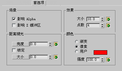 “首选项”面板定义了高光上的点数及其大小、阻光设置以及其是否影响 Z 缓冲区或 alpha 通道。