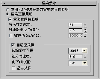 卷展栏上的前两个选项控制渲染器如何处理直接照明。重用“光能传递解决方案”的“直接照明”可以进行显示光能传递网格颜色的快速渲染。渲染“直接照明”使用扫描线渲染器以提供直接照明和阴影。第二个选项通常比较慢但更加精确。对于“渲染直接照明”,光能传递解决方案只提供直接照明。