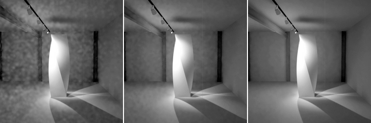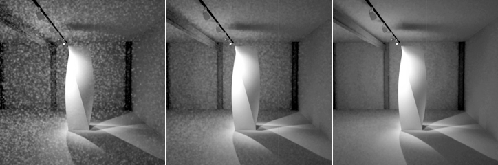增大每采样光线数会显著地增加渲染时间。在进行渲染时,右侧的图像花费的时间几乎是左边图像的六倍。增加过滤器半径也会增加渲染时间,但不会明显地增加。
