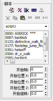 使用“定位”、“旋转”和“开始帧”控件来定位整个动画。如果在一个带有其它对象或角色的场景中编辑某一角色的脚本,那么可以使用这些控件来给该动画定位(相对于该场景的其它部分)。