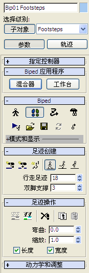 在视口中,足迹代表 Biped 脚部在空间中的支撑周期。可以在视口中移动和旋转足迹。在轨迹视图中,每一足迹显示为一块,代表 Biped 的脚部在时间上的支撑周期。在轨迹试图中,可以适时地移动足迹。在视口中,足迹的位置和方向控制 Biped 步幅的位置。
