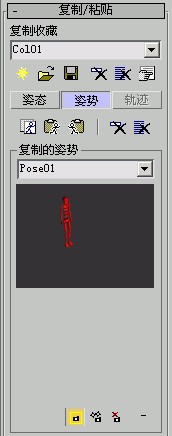 “运动”面板上的复制/粘贴卷展栏提供复制和粘贴两足动物姿势、姿态与轨迹的控件。姿势是任何选定 Biped 对象的旋转和位置。姿势是某特定 Biped 中所有对象的旋转和位置。轨迹是任何选定 Biped 部位的动画。有关使用轨迹的信息,请参见复制和粘贴轨迹。