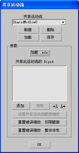这样便加载了共享运动流并应用到了新的 Biped 组中。对话框列表中显示 Biped 的名称。如果“(比例错误)”出现在 Biped 名称之后,使用“重置错误比例”来更正比例。