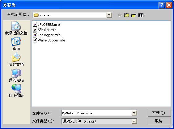 从“运动流”卷展栏保存、加载和附加 MFE 文件。
