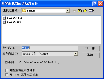 注: 如果在当前会话过程中想搜索引用的 BIP 文件,但是不想向 biped.ini 文件添加目录,则启用“添加待搜索的目录”。