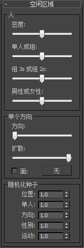 在“填充”中,空闲区域是一个模拟人在该区域自行“闲逛”或与其他人互动的曲面。可见的特征包括圆(显示一组人交谈)和标记(显示每个角色的位置、起始方向和性别,红色和蓝色分别代表女性和男性)。