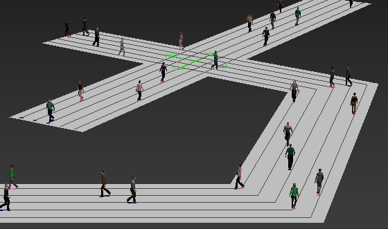 (播放动画)。随着动画的播放,人会沿着流行走。当人遇到两个流的交点时,他们可能会左转或右转沿其他流行走。如果没有出现这种情况,请尝试增加“密度”值。然后重新模拟并再次播放动画。