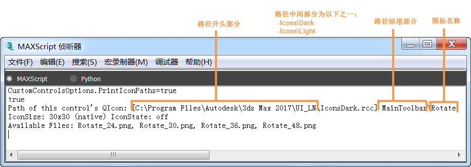 该图标的位置路径、大小、状态和可用文件将显示在“MAXScript 侦听器”中。