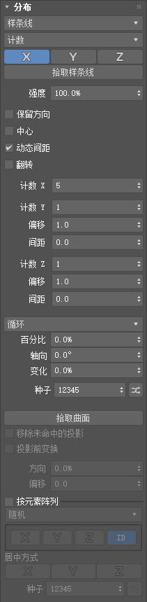 - 默认菜单:进行选择 >“修改器”菜单 >“参数化变形器”>“阵列”>“分布”卷展栏 >“样条线”