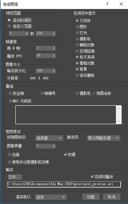 默认情况下,完成预览后,3ds Max 将启动媒体播放器来播放准备好的预览 _scene.avi 文件。如果不想启动媒体播放器,请清除“完成时播放”复选框。