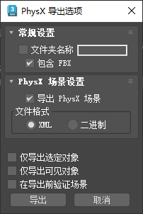- 使用指定的数据类型以 PhysX 格式保存场景(请参见以下内容)。
