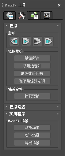 “模拟”子菜单上的“播放模拟”以及 MassFX 工具栏上的