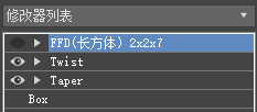- 在“修改器堆栈”中,启用先前禁用的三个修改器:“FFD”、“扭曲”和“锥化”。