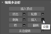 3. 在“编辑多边形”卷展栏中,单击 “插入”按钮旁(恰好在主按钮右侧)的“设置”按钮。