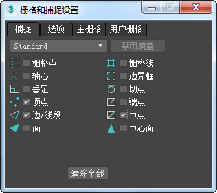 - 在“捕捉”面板上,单击“全部清除”,然后启用“顶点”、“边/线段”和“中点”。