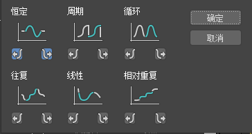 此对话框会针对如何在您创建的关键点范围外继续动画部分提供了各种选项。每个选项都由一个图形按钮表示。在图形中,原始动画由实线轨迹表示,继续动画的效果由虚线轨迹表示。