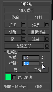 - 在“修改”面板的“编辑边”卷展栏上,将“折缝”设置为 1.0。