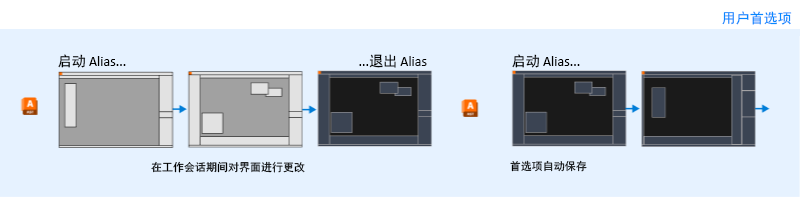 Alias 会自动将您对用户界面所做的所有更改存储在用户首选项中。这意味着,关闭 Alias 后,下次启动时,界面将与您退出时完全一样。