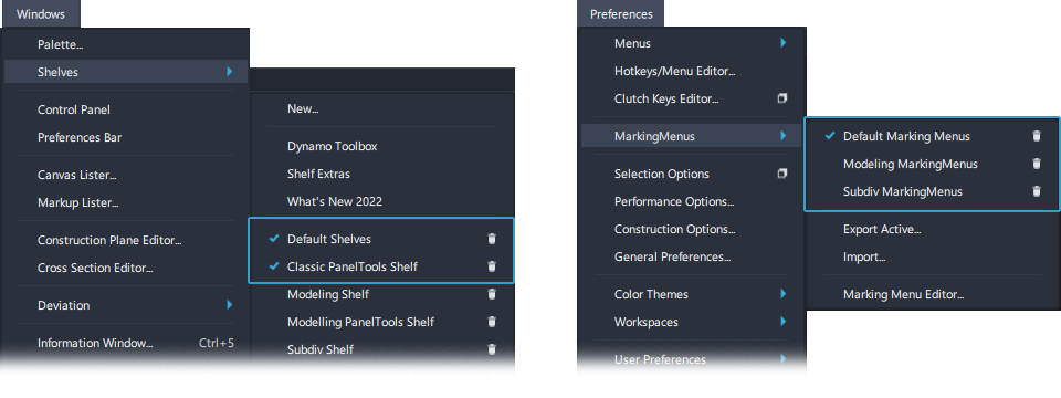 先前版本中使用的主工具架将加载到“Windows”>“Shelves”>“Default Shelves”中。