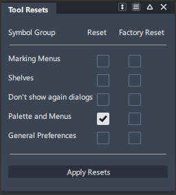 “Utilities”>“Tool Resets”,当对工具箱和菜单使用“Reset”而不是“Factory Reset”时。