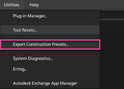 通过选择“Utilities”>“Export Construction Presets”,将构建预设导出为 .json。