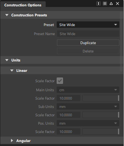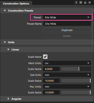 如果您需要更改某个预设集,请使用“Duplicate”按钮创建您要编辑的预设集的一个副本,然后编辑该副本。始终会自动保存对“Construction Options”窗口中设置所做的更改。