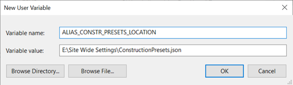 将环境变量 ALIAS_CONSTR_PRESETS_LOCATION 设置为站点范围的构建预设文件所在的网络位置(路径)。