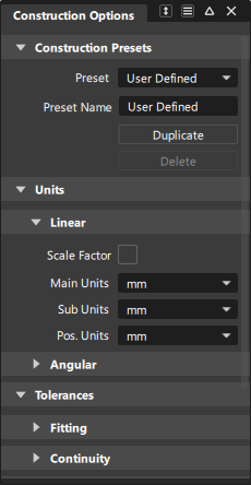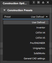 使用“Construction Options”可以设置建模工具强制采用的公差。向特定 CAD 软件包传输数据的要求作为预设提供。