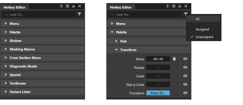 可以为工具架上的任何项指定热键,这意味着您可以为同一工具指定不同的热键。例如,“Look-At”工具有默认热键 Alt + L 和 F,两者可以在不同的工作空间中使用。