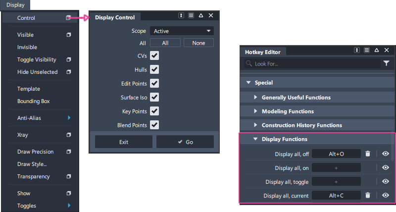 例如,“Special”>“Display Functions”列出了“Display”>“Control”工具的不同设置,可以设置这些设置以快速显示 CV 和外壳线:
