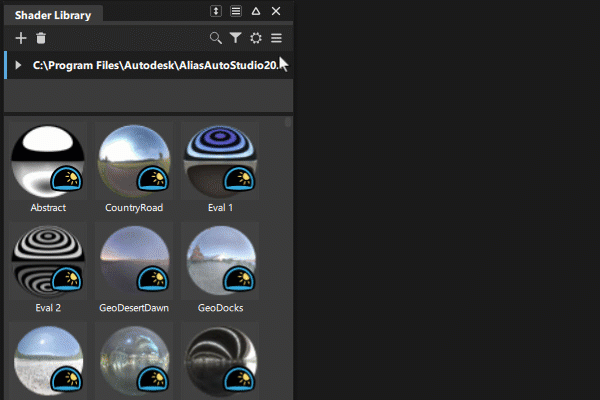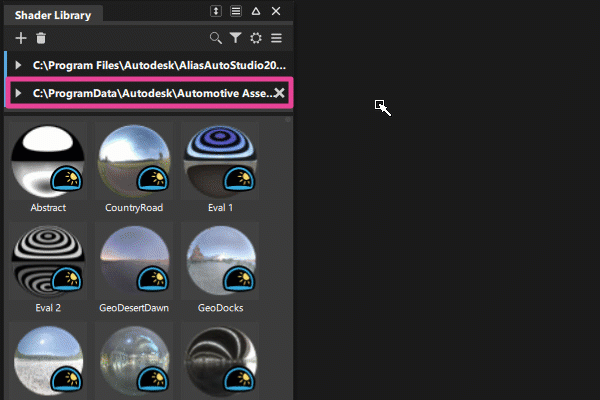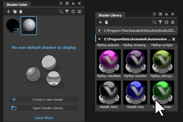 要在 Alias 中使用材质,请在“Shader Library”中从“More”菜单选择“Automotive Assets”。