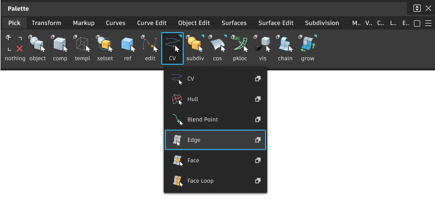 拾取或取消拾取 NURBS 对象上外壳线线段的两个相邻顶点或细分对象的单个边。如果无法选择细分边或 CV,请确保在“Control Panel”的“Display”部分中启用了“CV/Hull”。