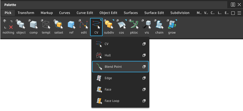如果过渡点控制点已处于拾取状态,请按住该键并按箭头键以逐一拾取周围的 CV、编辑点、外壳线或过渡曲线控制点。