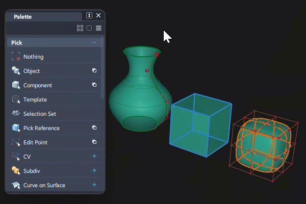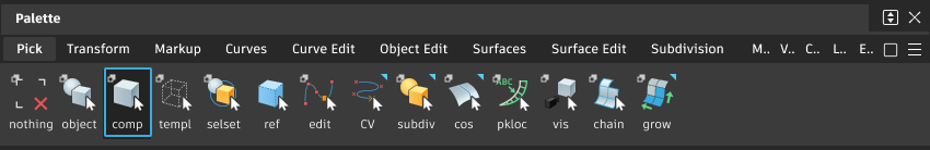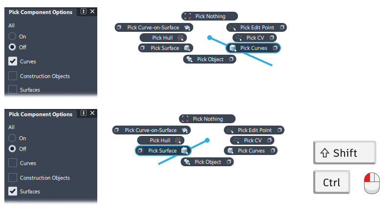 在“Pick Curves”和“Pick Surfaces”的默认标记菜单中,使用兩次“Pick Component”: