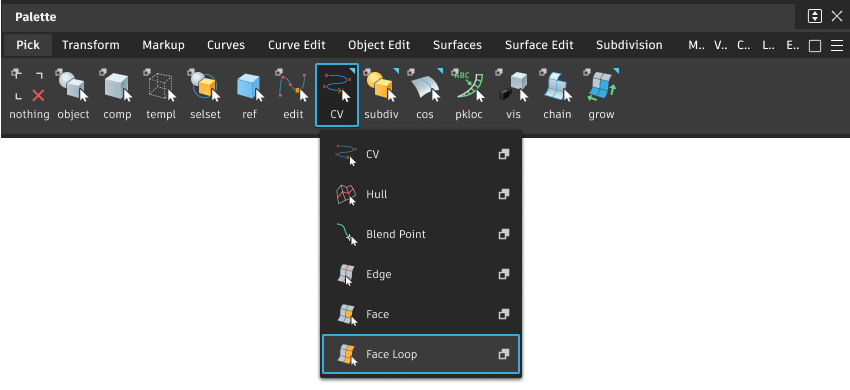 拾取或取消拾取 NURBS 曲面上沿某个循环外壳线的所有 CV 或细分对象上沿某个循环边的所有面。