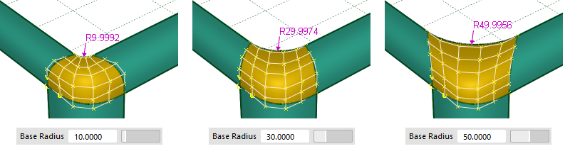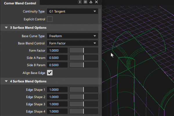 Freeform - 使用自由形式过渡曲线构建第四条边。“Freeform”允许您沿第四条边调整开始和结束接触点的位置。在某些情况下,这有助于避免结果中出现钝角或锐角。通常,只调整由“Fillet”提供的“Base Radius”和“Form Factor”值很难消除这些类型的变形。这是默认设置。