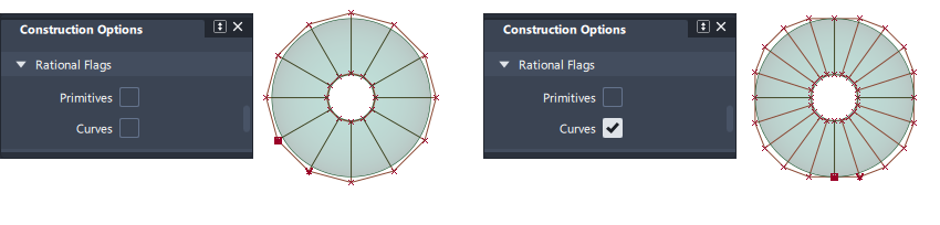 请注意在“Construction Options”中选择的“Rational”设置,因为这些设置将影响旋转曲面的 CV 结构。