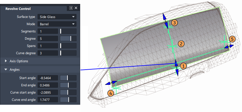 要构建筒体侧面玻璃,请指定五个点(通常捕捉到参考曲面或网格)和轴方向(通常是车辆的 X 轴,中心线沿着 X 轴):