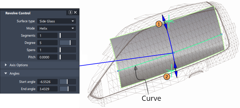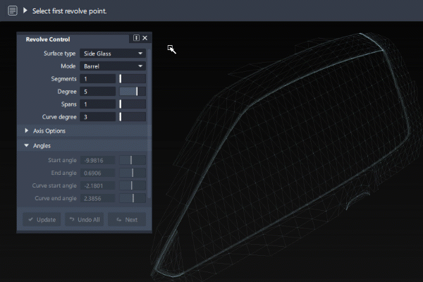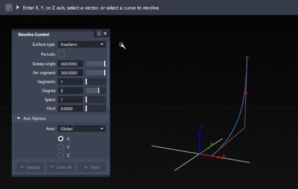 “Revolve”工具最好在打开控制窗口的情况下使用,以便可以交互式地修改值。