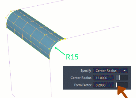 如果要保持圆角的恒定接触线,同时使用“Form Factor”调整形状,请指定“Tangent Offset”、“Chordal Length”或“Tangent Length”。顶点半径将随“Form Factor”的修改而更改。