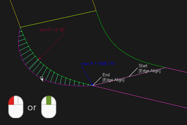 在将“Construction Type”设置为“Arc (Chord)”、“Existing Theoretical”或“Build Theoretical”的情况下指定圆角宽度时,将显示此选项。使用这些构建类型时,无法明确设置半径值。