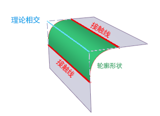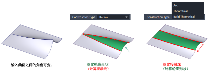 如果将“Construction Type”设置为“Radius”,可以通过“Radius”值(或非圆形圆角的“Center radius”/“Tangent length”值)指定轮廓形状。然后使用“Surface Fillet”工具计算接触线。