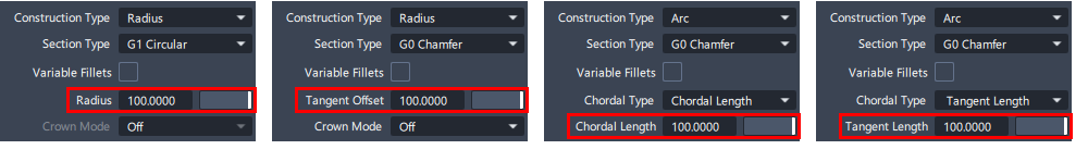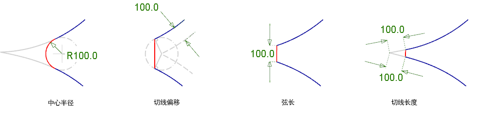 如果选中此选项,可以在圆角段上不同的点设置半径或弦长/切线长度(请参见下文)。