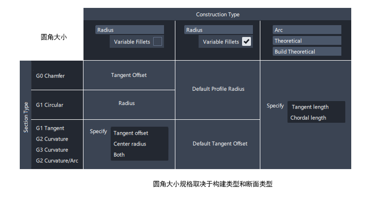 要更改圆角曲面的大小,我们通常将其尺寸视为半径值。对于简单的“G1 Circular”圆角,这些值就是所显示的选项。