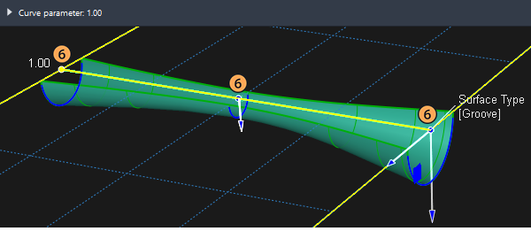 只有选择了“Groove”选项时,才能使用“Flip”选项,通过该选项,您可以将槽翻转到输入曲面的另一侧,以创建凹凸效果。屏幕上的操纵器指示将在哪一侧构建管状体。