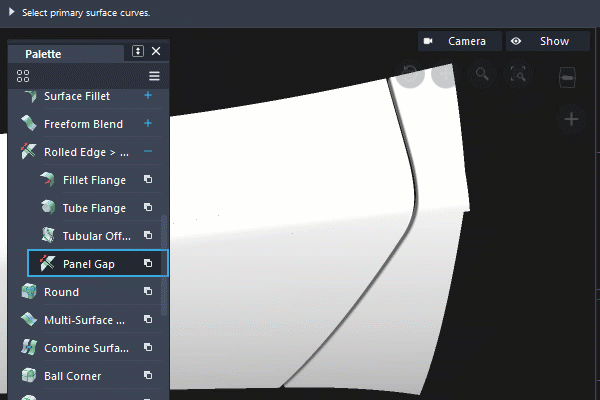 “Panel Gap”使用与“Fillet-Flange”工具相同的方法来创建指定间隙两侧的曲面。输入曲面和曲面曲线必须切线连续。