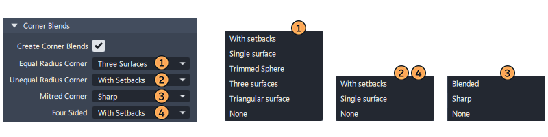 Mitred Corner指定两个圆角曲面在斜接角点处的相交方式。