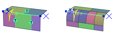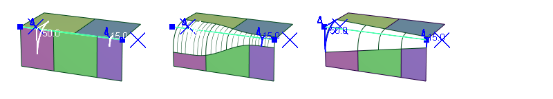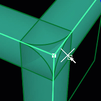 如果两条或多条边具有切线连续性,则会将它们视为一条边。这样,创建跨曲面的平滑可变半径圆角只需要两个半径操纵器(而不是每条边一个)。但是,该圆角将针对每条边包含一个单独的曲面。