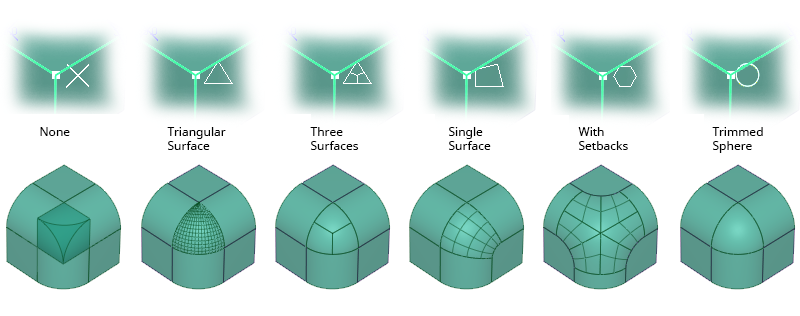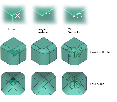 单击角形操纵器图标可以在所有可能的角形几何体选项之间进行切换。如果“Control Options”中的“Auto Update”处于启用状态,则选择每个图标时将会重建角点;否则,请使用“Build”按钮更新圆化的几何体。